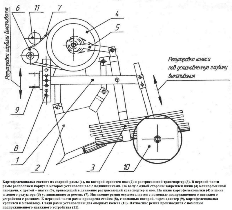 Le couteau est fixé au cadre avec un joint pivotant. Il coupe la couche de sol avec les pommes de terre. Pendant la rotation du tambour, les mottes de terre se brisent et se réveillent à travers la grille, et les tubercules tombent sur les terres arables.
