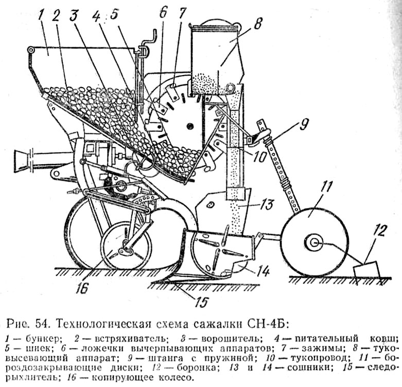 Dans la conception du semoir de pommes de terre SN-4B, les roues sont utilisées exclusivement pour soutenir et déplacer l'unité après le tracteur tirant (elles sont reliées au châssis avant).