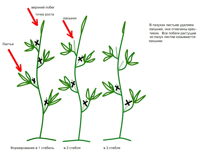 Le schéma à trois tiges prévoit la préservation de deux pas en plus de la tige principale. Sous le premier bouquet, il reste deux pousses fortes. Ce schéma est extrêmement rarement utilisé dans les serres.