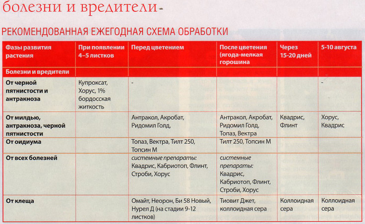 Lorsque les baies atteignent la taille d'un pois, les buissons sont pulvérisés avec des fongicides (par exemple, «Ridomil Gold» ou «Topaz») pour prévenir et traiter la tache violette, l'oïdium, la pourriture grise des fruits et l'oïdium.